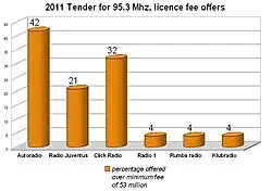 Since the results of the other tenders (invited with identical terms and conditions as 95.3Mhz) were not attacked in court, the winner, Juventus radio was given the green light to start broadcasting on 1 February on 103,9 MHz. Juventus has to pay a yearly license fee of 52 million forints for using that frequency.[20] Klubrádió submitted only a bid for a single one of three identical tenders, raising concerns that it was just a try in order to lose the bidding on purpose. Klubrádió's financial offer was also inferior to other tender participants, as well as conditions offered.[15] After the results of Klubrádió's second place were announced, an intense media campaign was immediately launched by Klubrádió.