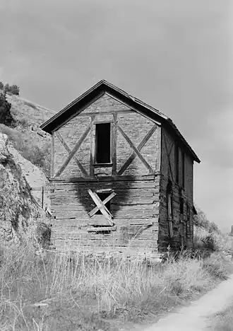 Kluge House, also known as Maverick House, is a rare example of Silesian fachwerk, log and half-timber construction, located in Helena, Montana.[2][3] In mid-1964 the home was almost destroyed as a fire hazard as it had fallen into disrepair and transients were living in it.[4][5] A shed is attached to the north side of the house. The second floor was built in 1882. Prior to that Kluge had apparently done significant work on the original cabin's first floor, which has hewn squared logs. The second floor is half-timber filled in with bricks. The second floor diagonal logs brace the framing logs. The overall dimensions of the house are 30'-11" x 16'-4" with a foundation of stone found locally. There are front and rear doors on the first floor. The front door is asymmetrically located and the rear door is near a corner. The second floor is reached only via an exterior staircase. The house has a brick fireplace. The first floor has an entrance vestibule and two rooms of dissimilar size. The smaller room has a hatch leading to a cellar. The second floor has a floor plan that is very similar to that of the first floor but it is reversed, i.e., two rooms and a vestibule. Floors are wooden.[2]
