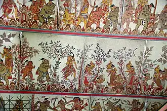 The city was known at that time for its arts, painting, dance, and music. At the end of the 18th century, the Kerta Gosa Pavilion, also spelled Kertha Gosa or Kertha Ghosa, the Hall of Justice, was erected in the northeastern corner of the palace compound. It typified the Klungkung style of architecture and painting. Because the Kerta Gosa was the court of the high king of Bali, cases on the island that could not be resolved were transferred to this site. Three Brahmana priests presided over the court. The convicts (as well as visitors today) were able to view the ceiling which depicted different punishments in the afterlife, and the results of karma, while they were awaiting sentencing. The ceiling paintings of the Kerta Gosa are one of the outstanding examples of Kamasan Wayang style.[16] The paintings were probably originally done in the middle of the nineteenth century, and renewed in 1918, 1933, and 1963, with individual panels repaired in the 1980s and 1990s. Leading artists of Kamasan village such as Kaki Rambut, Pan Seken, Mangku Mura, and Nyoman Mandra have been responsible for the repaintings in the twentieth century. The main paintings depict the story of Bima in heaven and hell, but other stories depicted are the Tantri, the Garuda story, and scenes predicting the portents of earthquakes (Palindon).