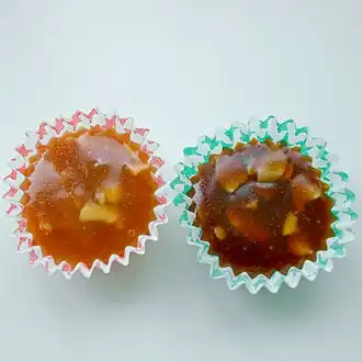 ![]() Two pieces of knäck. Left one made with Swedish light syrup (ljus sirap), right one made with the dark variety (mörk sirap). | |
