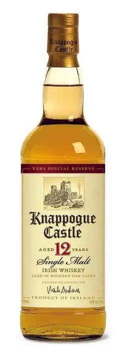 - Knappogue Castle 12 Year Old Single Malt: Marketed as a “super premium” Irish single-malt, Knappogue Castle is distilled three times, and adds no color to its final product. It is aged in bourbon barrels for 12 years before bottling. 80 proof.