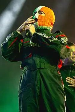 Kneecap's logo is based on the balaclavas worn by paramilitaries during the Troubles. DJ Próvaí often wears an Irish tricolour balaclava in public.[10][11][12] The Guardian wrote that Kneecap's earlier work focused on merging Gaelic identity with hood culture; in Northern Ireland, "hoods" are petty criminals and drug dealers.[10]