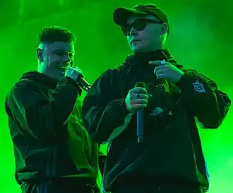 Kneecap are an Irish hip hop trio from Belfast, Northern Ireland, composed of Mo Chara, Móglaí Bap and DJ Próvaí,[1][2] the stage names of Liam Óg Ó hAnnaidh, Naoise Ó Cairealláin and J. J. Ó Dochartaigh, respectively.[3] They rap in a mixture of English and Irish. Their first single "C.E.A.R.T.A." (cearta is Irish for 'rights') was released in 2017, followed by their debut studio album, 3CAG, in 2018.[4] Their second studio album, Fine Art, was released in 2024, and a biographical film was released later the same year.[5]