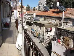 Although the community bylaws called for the planting of trees and plants in the central courtyard, this directive was largely ignored.[16] Residents drew water from two cisterns located in the courtyard. By the end of the 19th century, years of drought led the Central Committee to purchase a water tanker from the Jaffa–Jerusalem railway company. Water was drawn from outlying wells, delivered by train to the railroad station, and then delivered by donkey to the neighborhood.[15]