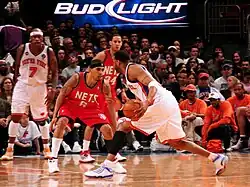 Both sides have begun marketing in earnest throughout Manhattan and Brooklyn, often proclaiming they are the sole "team of the borough" with billboards displaying their newly acquired superstars, Carmelo Anthony and Deron Williams.[17] One of the first moves of Prokhorov's ownership of the Nets in 2010 was to purchase a large 225-by-99-foot (69 m × 30 m) painted billboard, featuring himself, then Nets part-owner Jay-Z and the words "Blueprint for Greatness" on the side of a building at 34th Street and Eighth Avenue facing Madison Square Garden, home of the Knicks.[18] The Knicks responded to the Nets' marketing push with a television commercial stating, "You can walk like us, you can talk like us, but you ain't never gonna be like us." This prompted Prokhorov to respond: "I think we'd more like to be like the Lakers [winners of 16 NBA championships]."[19] Marty Markowitz, the former borough president of Brooklyn, has derisively called the Knicks the "Manhattan Knicks" and claimed that any Brooklynite who supported the Knicks was committing "treason".[20]