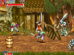 The gameplay is similar to other Capcom beat 'em ups, such as Final Fight and Capcom's previous hack-and-slash fantasy title The King of Dragons. There are seven stages, each with its own boss and a variety of generic enemies that try to stop the players' progress.[3] The fights rely strongly on the blocking ability, which is triggered by pressing the attack button, then pressing the joystick away as the opponent strikes. If successful, the player gains a few seconds of invincibility with which to counter-attack, but if no one strikes the player's character while holding the block, they will tire and drop their guard, making them vulnerable to attack. Blocking is vital in certain cases, since some bosses will be vulnerable only after their attack has been blocked by the player.