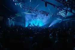Since 2013, Knockdown Center has been the venue of many musical and visual art events. As of 2022, artists who have performed there include Wu-Tang Clan, LCD Soundsystem, Jeff Mills, Kim Gordon, Turnstile, Arca, Frank Ocean, Kneecap Honey Dijon, Animal Collective, Juice World, James Blake, Fred Again, Sunn O))), Yung Lean, CNBLUE, and Chelsea Manning.[1] Earlier in the same year, Pitchfork announced an all-new concert series called Pitchfork Presents, to be hosted at the Center. The venue has been called the "Queens' answer to The Kitchen,"[2] a reference to the notable avant-garde performance venue in Manhattan's Chelsea district.