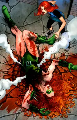 Knockout joins the Secret Six mercenary team alongside Scandal.[9] A mission that brings the Secret Six into conflict against the Birds of Prey has Knockout challenge her former inspiration, Barda, in single combat.[10] During the Final Crisis event she is killed by Infinity-Man, before eventually being resurrected by the Six.[11][12]