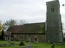 The fabric of the nave is of Norman date, though the only remaining feature of Romanesque carving is the north doorway, now partially blocked. The windows contain some later medieval stained glass. The 15th-century tower was built with a bequest from one John Jenney (lord of the manor, died 1460) and his wife, who have a monumental brass in the church.[2] The tower has flint facings and was restored in the 19th century: it has one bell.[10] A vestry was added in 1838. The church also has a burial ground.[15] On 7 December 1966, the church became a Grade II* British listed building.[16]
