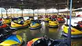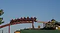 Motorcycle Chase, a modernized steeplechase rollercoaster built in 1976 by Arrow Development, featured single motorbike-themed vehicles racing side-by-side, each on one of four parallel tracks, launched together.[30] One or two riders straddled each "Indian motorcycle" attraction vehicle. The tubular steel monorail track closely followed dips and bumps in "the road" and tilted to lean riders about the curves. Gasoline Alley, an electric steel-guide rail car ride below, was built together and intimately intertwined, which enhanced ride-to-ride interaction thrill value.[33] Rider safety concerns of the high center of gravity coupled with the method of rider restraints caused it to be rethemed Wacky Soap Box Racers with vehicles themed to look like soap box racers, each seating two riders, strapped in low (nearly straddling the track), surrounded by the close-fitting car sides, and the dips and bumps of the track were straightened flat in 1980. Motorcycle Chase/Wacky Soap Box Racers was removed in 1996 for a dueling loop coaster Windjammer Surf Racers and now Xcelerator, a vertical launch coaster, takes its place.