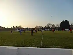 The club play at the Robin's Nest ground on Hampton Road. A clubhouse was built on one side of the pitch shortly after World War II.[1] An overhang from the building's roof provided cover to two rows of seating and a small covered standing area was provided on the same side of the pitch. However these were destroyed in 2017 during Storm Doris, leaving the club with no clubhouse or covered seating.[11] In October 2018 a temporary modular unit building was installed on site to serve as a clubhouse. A permanent new 50-seat stand was opened in 2020.[12]