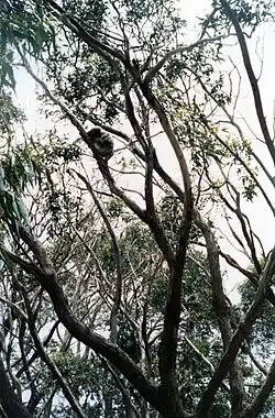 Flinders Chase National Park, at the far west of the island, was set up in the early 20th-century as a habitat for Australian mammals and birds whose survival on the mainland was threatened, especially from foxes and rabbits, from which the island is free. In 1923 six "native bears", as the koala was then popularly known, were donated by the National Park of Victoria, Wilson's Promontory,[38] and taken across to KI on the Karatta in November 1923 by three members of the Fauna and Flora Board: J. C. Marshall, professors T. G. Osborn and Wood Jones, and Edgar R. Waite, director of the Adelaide Museum.[39] Another six pair, with young, were released by the board in 1925.[40][a] The population grew steadily: in 1934 researchers located several with difficulty,[43] living on Eucalyptus ovata and the yellow gum E. leucoxylon; in 1943 a census found nearly 300,[44] and in 1949 another team saw 18 full-grown adults in a quarter of a mile (some (400 m), living on manna gums, pink gums (E. fasciculosa), and water gums.[45]