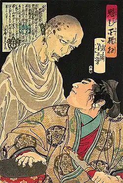 Kobayakawa Hideaki (小早川 秀秋) (1577 – December 1, 1602) was the fifth son of Kinoshita Iesada and a nephew of Toyotomi Hideyoshi. He was gained the rank of Saemon no Kami (左衛門督) or in China Shikkingo (執金吾) at genpuku and held the court title of Chūnagon (中納言), Hideaki was also called Kingo Chūnagon (金吾中納言).
