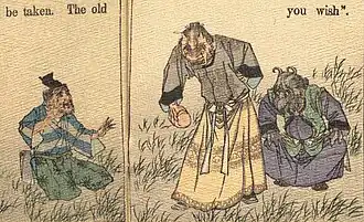There was one other translation also using Sazanami Iwaya as the Japanese textual source, namely "The Old Man with the Wen" translated by M. E. Kirby (volume 10 of 12 in the Iwaya's Fairy tales of Old Japan series, Eigaku-Shimpo-sha, 1903).[10][11] However, when the tale was reissued in the compendium edition Iwaya's Fairy tales of Old Japan (1914), only Hannah Riddell was given translator credit.Riddell tr. (1914)[d]