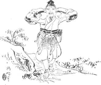 One day he went into the mountain to cut wood, and was caught in the rain. He took refuge in the hollow of a tree.[g] He was soon to witness a gathering of strange beings nearby, some one-eyed and some mouth-less.[15][20][14][h] They were the oni[21] (demons or ogres; "devils" being the Christendom equivalent[7]).[i]