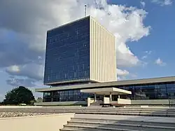 The Building was originally conceived as the third part of a complex, which was supposed to include a large conference hall (which would be a similar hall for the UN skyscraper). However, costs and overruns meant that part of the project has never been realized, though traces can still be seen today in form of the bridge supports designed to connect the hall with the main building.[6]