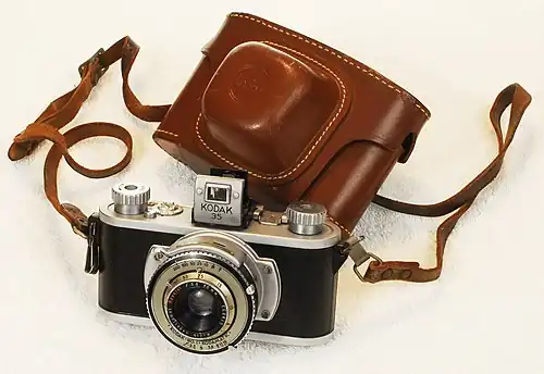 The first Kodak 35 had no rangefinder.[3] It slightly resembles cameras like the German Wirgin Edinex and Adox Adrette.[4] It takes thirty-six 24×36 mm frames on 135 film. The precision molded black Bakelite body has satin-chromed top and base plates, and a collapsible finder is mounted on top center. The removable Bakelite back with the attached base plate slides easily off for film handling. It is secured by a centrally located wing key in the base plate. Turning the key also slackens the spring tension of the chromed steel film pressure plate, a very unusual feature presumably incorporated to facilitate reassembling the camera rather than preventing scratching the film during rewind, which would have been a novel feature.