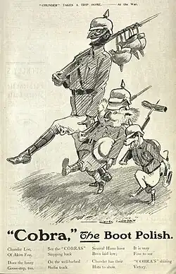 In 1908 the British firm of Blyth & Platt Ltd., manufacturers of Cobra Boot Polish, opened a factory in Sydney. In 1909 full-page advertisements for Cobra Boot Polish began to be published weekly in The Bulletin, each one including verse written by O'Ferrall.[16] The evolving series of advertisements featured a character from the Indian sub-continent named "Chunder Loo, of Akim Foo", his bevy of cobras and his two companions, an anthropomorphic koala and a fox-terrier.[1][17][16] The drawings of some early versions of the Cobra Boot Polish advertisements include the initials "N.L.", indicating that Norman Lindsay was the artist at that stage.[18] During the pre-war years of the White Australia policy, the depiction of racial stereotypes was a routine comedic device for artists and writers.[16] The advertisements proved to be so popular that in 1915 the proprietors of Cobra Boot Polish published a book entitled The Adventures of Chunder Loo, featuring O'Ferrall's verse and drawings by Lionel Lindsay.[19][20] During World War I the Cobra advertisements dealt with patriotic themes.[21] The advertisements continued to be published in The Bulletin until 1920.[22][C]