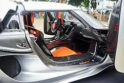 Despite the similar name, the CC850 does not share any components with the original CC8S and is instead based on the Koenigsegg Jesko.[6] Similar to the Jesko, the CC850 shares the same multilink front and rear suspension, which consists of double wishbones, hydraulic and gas-hydraulic shock absorbers, with Triplex dampers at the rear.[7] Steering is rack and pinion, with Koenigsegg's proprietary 9-speed Light Speed Transmission sending power to the rear wheels. The CC850 also has a feature called the Engage Shifter System, which allows the driver to simulate six gears of manual shifting with a physical clutch pedal as opposed to paddle shifters.[3] The engine is also borrowed from the Jesko, with smaller turbochargers, resulting in a power output of 1,185 hp (1,201 PS; 884 kW) at 7,800 rpm on regular fuel, or 1,385 hp (1,404 PS; 1,033 kW) on E85.[6][2] Peak torque is 1,385 N⋅m (1,022 lb⋅ft) at 4,800 rpm.[3] The forged aluminium wheels (20" x 9.5" front, 21" 12.25" rear)[3] are fitted with Michelin Pilot Sport 4S (265/35R-20 front, and 325/30R-21 rear).[6] Stopping power is provided by a set of 410 mm (16.1 in) 6-piston calipers on the front wheels and 395 mm (15.6 in) 4-piston calipers on the rear.[6]