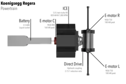 Realizing some form of compromise was necessary, von Koenigsegg decided to look to a hybrid solution. By removing the traditional 7-speed dual-clutch transmission and switching to a single-gear direct-drive system, Koenigsegg mitigated the added weight of the three electric motors and a 4.5 kW·h battery pack installed in the Regera as compared to the previous Agera models.[15] The single-gear electrical solution also provided the instant response that von Koenigsegg sought, while the onboard internal combustion engine would then maintain the rapid acceleration and power at higher speeds where the electric motors are less effective.