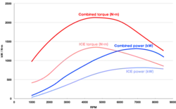 The Regera has a reported total power output of 1,340 kW (1,797 hp; 1,822 PS) through a hybrid powertrain. As in general, the Regera's internal combustion engine (ICE) generates its greatest power only at high rpm; however, due to the fixed gear, this corresponds to very high speeds. Power at low speeds is filled in by the electric motors, giving a maximum combined mechanical power output of 1,119 kW (1,500 hp; 1,521 PS) and 2,000 N⋅m (1,475 lb⋅ft) of torque.[13][21][22]