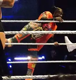 On the October 19, 2009 episode of Raw, Kingston spoke without a Jamaican accent during a televised segment, dropped the Jamaican character and began being billed from his home country of Ghana.[54][55] At Bragging Rights, Kingston wrestled as part of the Team Raw, which lost the match after Raw teammate Big Show betrayed them by chokeslamming Kingston, allowing Chris Jericho to pin Kingston to pick up the win for Team SmackDown.[56] After Kingston interfered in a match between Randy Orton and John Cena for Cena's WWE Championship match,[57] Orton and Kingston feuded, including a 5-men Survivor Series team against each other where Kingston's team won after he was the sole survivor, last eliminating Orton.[58] and TLC: Tables, Ladders & Chairs,[59] where Orton defeated Kingston.[60] They also participated in a triple threat match which included John Cena to determined a challenger for the WWE Championship at the Royal Rumble, which was won by Orton, who pinned Kingston.[61] Around a week earlier, on the January 4, 2010 episode of Raw, Kingston botched the finish of a match with Orton, and kept getting up despite the plan having been to take a punt kick on the ground from Orton. Orton was reportedly insulted by this, delivered a stiff RKO, and Kingston reportedly had a push stopped following complaints from Orton. He would remain a mid-carder for the next decade.[62][63][64][65] He competed in the Elimination Chamber match for the WWE Championship at Elimination Chamber, but was eliminated by the champion Sheamus. At WrestleMania XXVI, Kingston was unsuccessful in the Money in the Bank match, which was won by Jack Swagger.