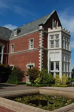 The English Tudor revival mansion was built for Charles Frederick Kohl and his second wife Mary Elisabeth "Bessie" (née Godey), as their country house.[3] The building was completed in 1914 by architect George H. Howard (1864–1935) and engineer John White, of the Howard and White firm.[1] The forty-acre estate included a brick structure with a gabled roof and approximately 42,000 square feet of interior space, 63 rooms, three stories tall and with a basement.[4][5] The grounds of the estate included a rolling landscape, a sunken English rose garden, tennis courts, green houses, large carriage house, and a 150,000 gallon water reservoir.[5]