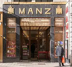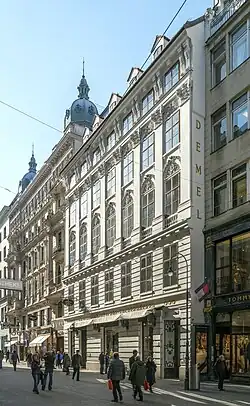 The Kohlmarkt is and has been the location of several high-end stores and former royal warrant holders over time, including warrant holders such as the pastry shop and chocolaterie Demel, the tobacco store Mohilla, the bookshop Manz, and the jeweler Rozet & Fischmeister.[10] However, with the end of the Habsburg monarchy as well as with increasing competition and rising rents, many traditional businesses have been forced to close their stores. In their place, several international luxury brands have moved in. With an average rent of €4,620 (as of 2016), the Kohlmarkt is the seventh-most expensive street for business owners in Europe and the most expensive in Austria.[11]