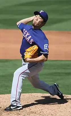 On July 30, 2011, Uehara was traded to the Texas Rangers for Chris Davis and Tommy Hunter. The move reunited him with his old high school teammate Yoshinori Tateyama.[7] After starting the season with superb numbers for the Orioles, his second half, with the Rangers, would prove to be a rough one. He was 1–2 with a 4.00 ERA after the trade. Matters would get worse in the postseason when he gave up three home runs in 1+1⁄3 innings to compile a 33.75 ERA before being left off the roster for the World Series due to his ineffectiveness. He would finish 2011 with a 2–3 record, 2.35 ERA, and 85 strikeouts in 65 innings after pitching for the two different teams.[8]