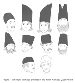 Kolah namadi (Persian: کلاه نمدی, kolāh namadī, pronounced: /koːˈlɒːh næmæˈdiː/) is a traditional Iranian wool felt hat worn by men in parts of Iran.[1] They come in a variety of colors and shapes depending on the region in Iran or the clan that wears it. Today they are worn mostly for ceremonial purposes.[2]