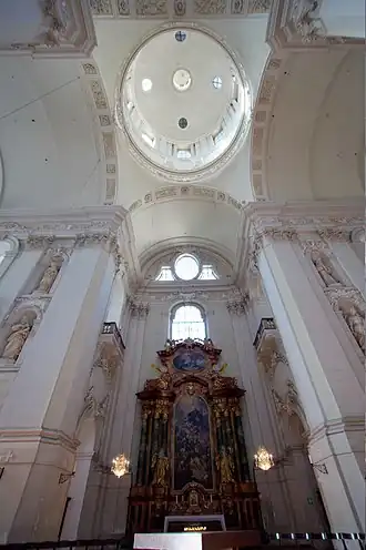 The building is the church of the University of Salzburg, located at the Universitätsplatz (University square). Bishop Paris von Lodron planned a university church on the location of the former Frauengarten, instead of using the Aula (main auditorium) for church services of the university.[1][2] While two successors were not able to realise the plan, Johann Ernst von Thun succeeded as part of his plan to develop Salzburg in Baroque style. The building by Johann Bernhard Fischer von Erlach was begun in 1694.[3] In 1707, it was dedicated to the Immaculate Conception, which is celebrated on 8 December, a national holiday in Austria.[2] It is believed that Mozart's Missa brevis in D Minor, K. 65, was commissioned by the church and premiered on 4 February 1769.[4]