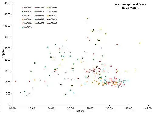 The above geochemical classification must be the essentially unaltered magma chemistry and not the result of crystal accumulation (as in peridotite). Through a typical komatiite flow sequence the chemistry of the rock will change according to the internal fractionation which occurs during eruption. This tends to lower MgO, Cr, Ni, and increase Al, K2O, Na, CaO and SiO2 toward the top of the flow.