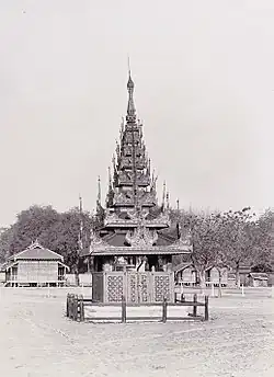 When a Burmese king died, his royal white umbrella was broken and the great drum and gong at the palace's bell tower (at the eastern gate of the palace), was struck.[1] It was custom for members of the royal family, including the king, to be cremated: their ashes were put into a velvet bag and thrown into the river.[2] King Mindon Min was the first to break tradition; his remains were not cremated, but instead were buried intact, according to his wishes, at the place where his tomb now stands.[2] Before his burial, the King Mindon's body was laid in state before his throne at the Hmannandawgyi (Palace of Mirrors).[3][4]