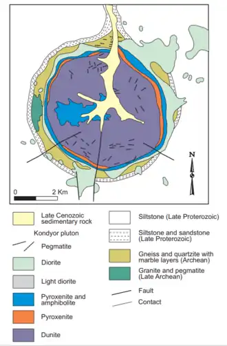 The Kondyor Massif (Russian: горы Кондёр) or Konder[1] is a circular intrusion of igneous rock,[2] about 8 kilometres (5 mi) in diameter. It is located in Khabarovsk Krai, Russia, c. 600 km (373 mi) west-southwest of Okhotsk, or c. 570 km (354 mi) south-east of Yakutsk. It is reached from Yakutsk by road via Amga. It is an important source of platinum.