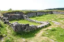 Archaeologists believe that there was a precursor to the Viking community Kungahälla which was located just south of Ytterby, and that this community was located on the lands of today's Ytterby near the great burial ground of Västra porten/Smällen.[8][9][10] In Ytterby, archaeologists have found remains of several buildings from the Iron Age built between 500 BC. and 600 AD. Of these, the largest is a hall building that was 48 meters long and 10 meters wide. This type of building belonged to the upper classes of society and the find may be the first find of a hall building from the migration period in Bohuslän, since the building was built between 400 and 600 AD.[11] The found of the remains of the hall building is believed to be a precursor to the royal estate that is mentioned in several sources, including in Njáls saga from the 13th century.[12] King Olav II Haraldsson of Norway, later known as Saint Olav, is said to have spent a year on these lands waiting for the inhabitants of Kungälv to complete his fleet before sailing to the Faroe Islands to demand taxes. The royal hall building was also occasionally inhabited by kings Olav Tryggvason, Harald Hardrada as well as other kings and magnates.[13]