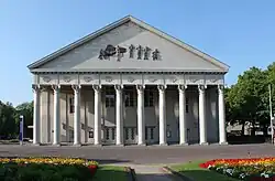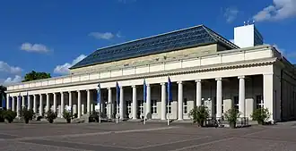 The Säulenportikus, destroyed in World War II, was not restored until 1993/94.[5] Since 1996, a concert scene by Stephan Balkenhol with six musicians made of glazed ceramics has replaced the relief Birth of Venus originally mounted in the pediment.[6] After the destruction of the theatre at Schlossplatz in 1944 and until the opening of the new building at Ettlinger Tor in 1975, the Konzerthaus served as a temporary venue for the Badisches Staatstheater Karlsruhe;[7]