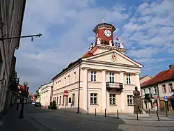 - The Town Hall, built at the beginning of the 19th century, has a façade encompassing four, tall Toscany Columns bearing a large pediment. Above the pediment is a small tower with a clock and a tall flagstaff from which the official flag of Konin is hung on local and state holidays.