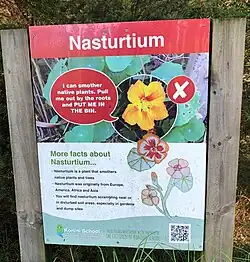 Konini School received a grant of $2306 from the Mazda Foundation in 2016, with the money designated for purchasing 386 native plants to restore the block of bush at the back of the school. The planting of the natives became a part of the school's programme of monitoring local streams and a teacher at the school was acknowledged for her role in developing a group to teach how to propagate native plants, learn more about the inhabitants of the streams and opening up the space as an "educational resource for learning about native fauna and flora".[56] A group of students called Stream Rangers Konini School established a blog to share what was being done to take care of the local streams. In 2016, the group posted suggestions for art that could be displayed on classroom walls to draw attention to the issues. The post also explained that the removal of dangerous weeds such as Deadly Knightshade and Wandering Jew was an essential part of the programme.[57]