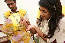 Huq travelled to Afghanistan with the charity Afghanaid to film a BBC Lifelines appeal, which was aired on 21 September 2008,[70] and the following year she travelled to India as part of Rotary International's "Thanks for Life/End Polio Now" campaign. She administered polio vaccine to children as part of the trip.[71]