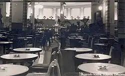 In 1920, part of the first floor was rented out by Richard Conrad's brothers Leonidas Konradas and Maksas Konradas, who established a cafe and sugar shop.[5] At that time, the cafe had two rooms. Rooms in the building were also rented by Valentinas Stabačinskas's clothing and hat workshop, and the hotel "Kęstutis" (not to be confused with Agota Samulytė's hotel "Kęstutis", which operated since 1919) was located on the second floor. The cafe experienced its first reconstruction in 1923, during which new furniture was bought. In the courtyard of the building's first floor there was also a bakery and four-room apartment owned by Maksas Konradas. The yard also contained one more brick and one wooden one-story house with apartments and ice cream parlor. In 1931 the building was connected to the city's sewage system, after which the cafe experienced a mild room expansion. In 1933, the cafe went into bankruptcy and its owners changed. Another renovation occurred in 1936, where the cafe was expanded outside for the summer season.[6]