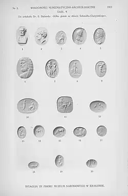 On 5 August 1883, Schmidt-Ciążyński arrived in Kraków with his engraved gem collection (and the remaining part of his collection).[40] The first public display of the collection took place in the Kraków Cloth Hall during the inauguration of the museum's exhibition of artifacts from the time of John III Sobieski on the 200th anniversary of the Battle of Vienna.[41] This exhibition was opened on 11 September 1883.[42] In the following days, successive engraved gems from Schmidt-Ciążyński's collection were unpacked and displayed.[43] The gem collection was presented in six cabinets, each containing 12 to 20 panels, with jewels arranged in the manner used by numismatists. In addition to the panels, various other objects of ancient art were exhibited. These included: enamel, Egyptian excavations, miniatures, cups, etc., as well as carved stones, such as Babylonian and Assyrian busts and gems, Babylonian and Phoenician cylinders, Greek and Roman bas-reliefs, Egyptian, Greek and Etruscan scarabs, and amulets (talismans) in various Eastern languages, vessels, vases, etc., carved deeply into stones, animals similarly represented as Greek and Roman relics, Greek and Roman gold, silver, iron, and bronze rings; Gnostic stones (abraxas gems) from the early Christian centuries, religious objects from the Middle Ages; coats of arms of distinguished European families carved in precious stones, and finally, proper gems (including masks and chimeras) such as cameos and intaglios, Greek, Roman, Renaissance, as well as the newest from the 18th and 19th centuries.[44]