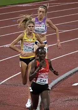 However, Klosterhalfen returned to fine form a month later at the European Championships on home soil in Munich, becoming the first German athlete to win the European Championship title at 5000 m.[91] She won decisively in this event with a time of 14:50.47, beating second-placed 2016 European 5000 m/10,000 m champion Yasemin Can by over six seconds.[94] It was the first double start at a major championships of her career as she also competed in the 10,000 m event three days earlier to finish fourth with a season's best.[95][93]