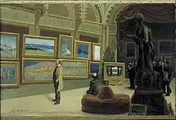 The Opponents, who had already agreed at the beginning of the year to join in an association, formed Konstnärsförbundet at a meeting on 18 August in Hotell Christiania in Gothenburg.[6] Their aim was "to oppose all antiquities which may be injurious, and to promote all reforms which may be considered beneficial to our domestic art and art industry".[7] One of the most pressing tasks was the organization of annual exhibitions, and as early as 8 October the first exhibition bearing the name of Konstnärsförbundet was opened in Stockholm. It included 150 works by 59 exhibitors.