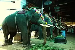 - Each day of the festival, a seeveli (procession of caparisoned temple elephants) is held twice, once in the morning and once at night, to the accompaniment of panchari melam (sacred music). Seventeen elephants take part. Two features of the seeveli are unique to the Koodalmanikyam Temple: first that two baby elephants are included in the procession, one standing on each side of the elephant carrying the deity. Second, while the headdresses ('netti pattam' in Malayalam) of seven elephants are made of pure gold, the rest are made of pure silver. The last two days of the festival feature panchavadyam (sacred music from an orchestra of five instruments), and the festival ends at the thiruvonam asterism.