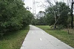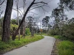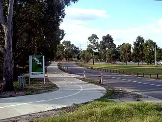 Both Dandenong Creek Trail and EastLink Trail run through the park on the primary north–south concrete path, before the trails split near the southern car park.[10] All trails were originally of fine crushed gravel, but in mid-late 2007, the existing Dandenong Creek Trail was upgraded to 3-metre (9.8 ft) wide concrete bike path from Boronia Road south to the former toilet block as part of the construction of EastLink. A new path of the same standard was constructed which leads further south to the Mountain Highway intersection with Burwood Highway, which forms part of the EastLink Trail, opened in mid-2008.[11] The primary path exit at the north of the park leads under Boronia Road and continues to run alongside the Dandenong Creek while the southern path (the EastLink Trail) leads further along EastLink to the south, and the southwest path (the Dandenong Creek Trail) crosses the Dandenong Creek and meets the Burwood Highway in Vermont South, with this link being constructed as a boardwalk and opened in 1997.[1]