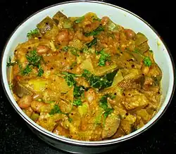 Kootu curry is a thick curry made with vegetables and legumes. The vegetables that are added in this curry are yam, ash gourd, carrots, snake gourd, pumpkins and plantains.[2] The legumes used are black chickpeas, Bengal gram.[3] Kootu Curry is one of the most important dishes of Onam Sadhya Feast.[4]