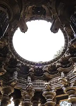 Entering the Svarga Mandap, there is a circular opening seen at the top. It is supported by 48 hand-carved pillars. At the periphery of the Svarga Mandap there are carved idols of Lord Ganesh, Karthikeya swami, Lord Kubera, Lord Yamraj, Lord Indra, etc. along with their carrier animals like peacock, mouse, elephant, etc. Standing at the center of the Svarga Mandap, one can see idols of Lord Brahma on the left hand side wall of the entrance of Sabha Mandap. In the center, people can see the Shiva Kopeshwar shivling situated in the Garbh Gruha & towards the right hand side wall the carved idol of Vishnu is visible. A stone pedestal mounted east of the temple's southern door has a carved inscription in Sanskrit, written in Devnagari script . It mentions that the temple was renovated in 1136 by Raj Singhadev of yadav dynasty.