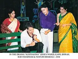 Kopil Bora acted in the play Narakor Gopan Kakhyat with Zerifa Wahid, staged in Rabindra Bhawan, Guwahati. It was an adaptation of the French play "In Camera" by Jean-Paul Sartre.[5] In another play with Zerifa Wahid, Pancharatna, which was also staged in Rabindra Bhawan, he played a gay boy troubled by his sexuality. He was also the associate director of the play called Agnibristi where he played the lead role, under Zerifa Wahid's production, staged in Rabindra Bhawan. It was an adaptation of Girish Karnad's play The Fire and the Rain.