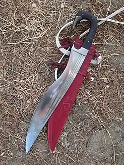 The kopis is often compared to the contemporary Iberian falcata and the more recent, and shorter, Nepalese kukri. The word itself is a Greek feminine singular noun. The difference in meaning between kopis and makhaira (μάχαιρα, another Greek word, meaning "chopper" or "short sword", "dagger") is not entirely clear in ancient texts,[5] but modern specialists tend to discriminate between single-edged cutting swords, those with a forward curve being classed as kopides, those without as makhairai.[6]