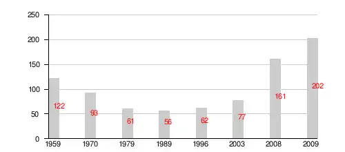 | Year | 1959 | 1970 | 1979 | 1989 | 1996 | 2003 | 2008 | 2009 |